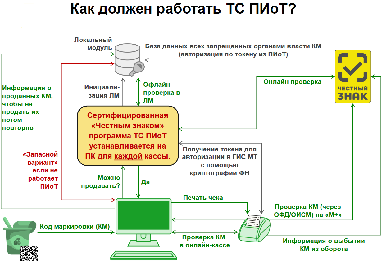 - При продаже йогурта, при сканировании кода маркировки ПиОТ отправляет запрос в систему «Честный Знак». Если ответа нет в течение 1,5 секунд, программа сверяет марку в локальном модуле кассира: если там марки нет, проверка считается пройденной.