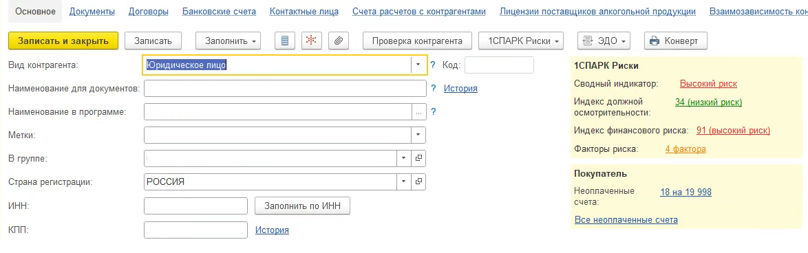 Сервис 1СПАРК Риски — это интеграция 1С с системой СПАРК-Интерфакс. Он встроен прямо в рабочие процессы и начинает работать уже на этапе создания карточки контрагента.