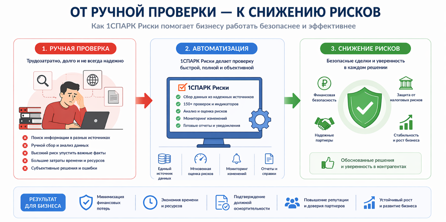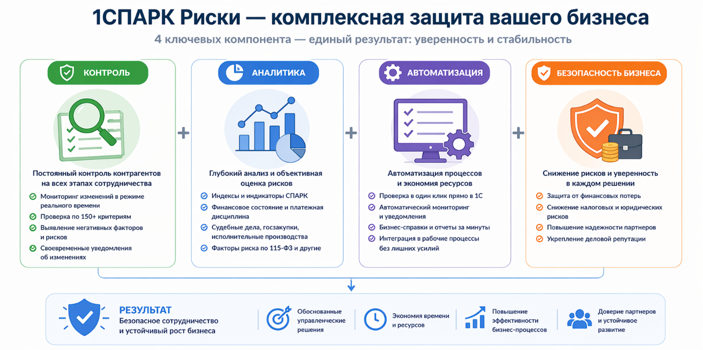 Именно поэтому в современных условиях проверка контрагентов — это уже не разовая процедура, а постоянный процесс. В новых версиях 1С для этого активно используется сервис 1СПАРК Риски, который помогает автоматизировать контроль и снизить вероятность ошибок.