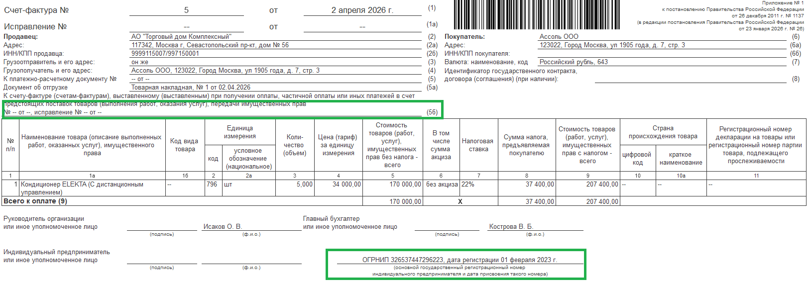 Одно из ключевых нововведений — необходимость указывать сведения об авансовом счёте-фактуре при отгрузке. Теперь связь между авансом и реализацией фиксируется прямо в документе.
