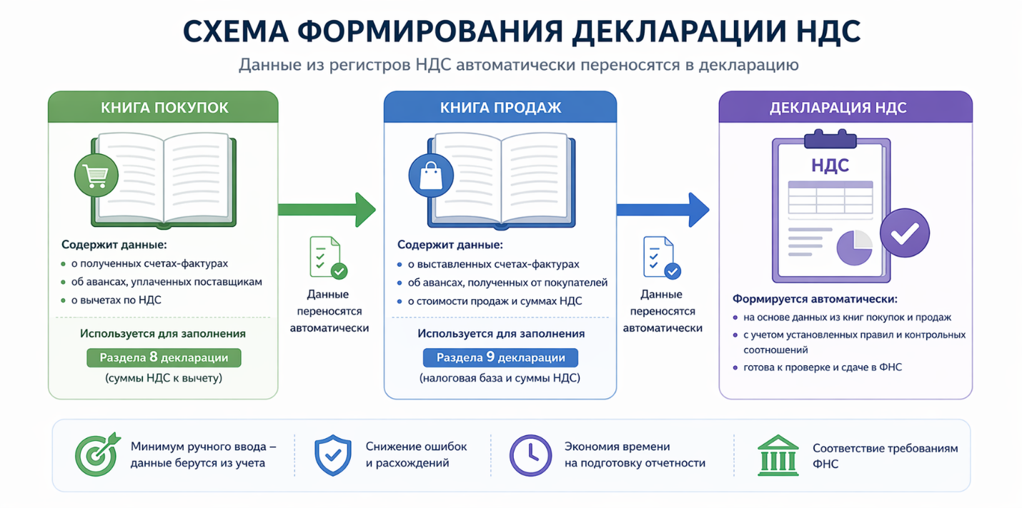 Теперь данные из книг покупок и продаж напрямую участвуют в формировании отдельных разделов декларации. Это усиливает автоматизацию и снижает вероятность ошибок.