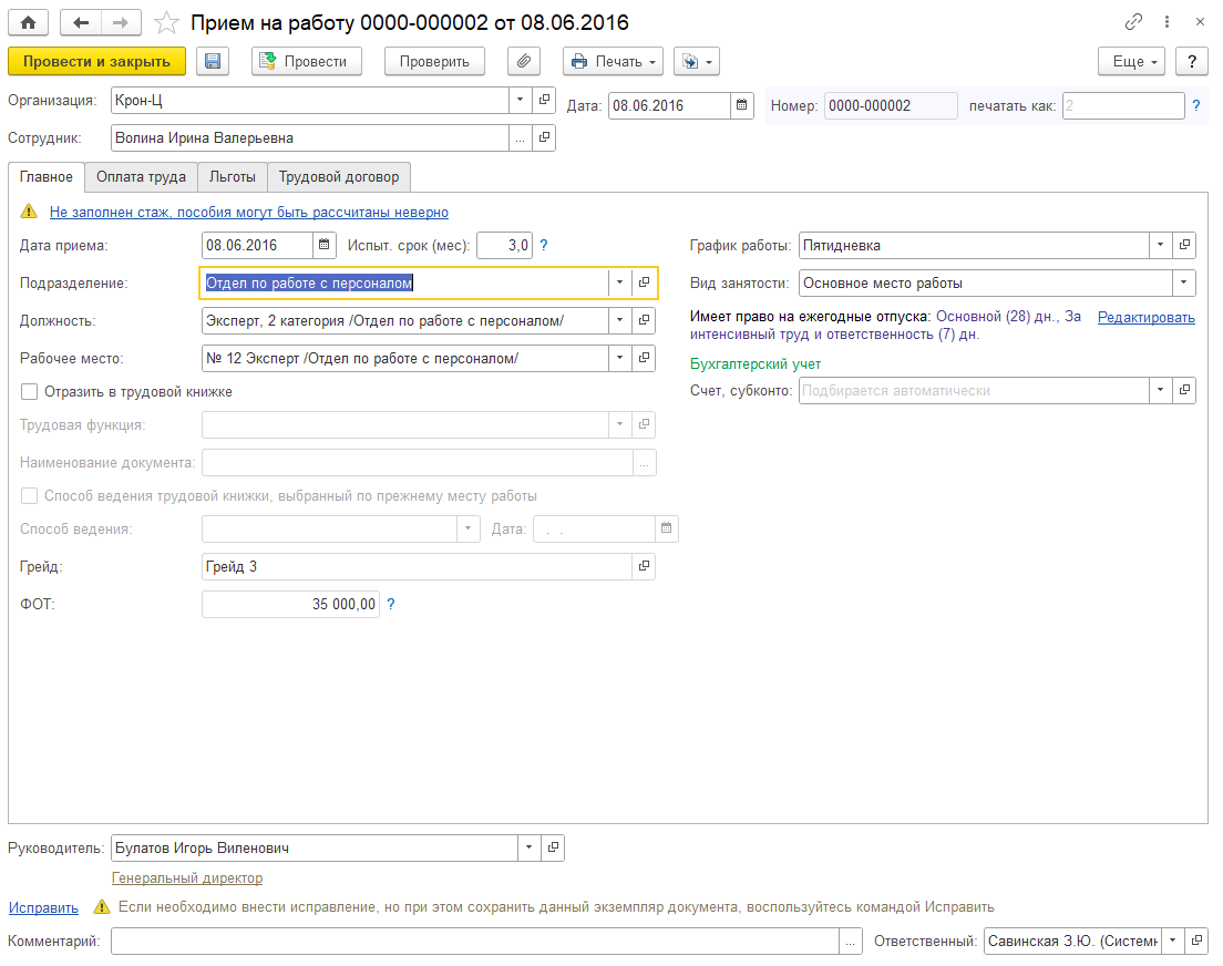 При приеме на работу в системе фиксируются ключевые параметры: подразделение, должность, условия оплаты труда и испытательный срок.
