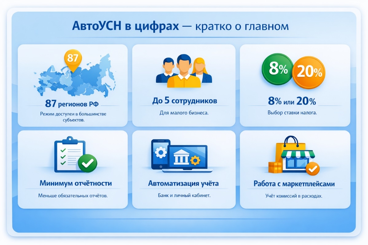 Автоматизированная упрощённая система налогообложения (АвтоУСН) продолжает развиваться как экспериментальный режим, направленный на максимальное упрощение налогового учёта для малого бизнеса.