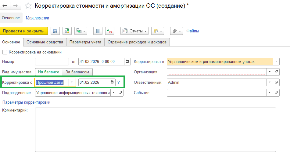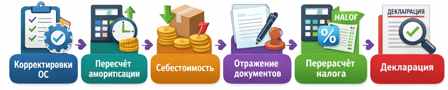 если в прошлый период не попали расходы по объекту — теперь их можно учесть, увеличив стоимость ОС, и система сама пересчитает амортизацию.