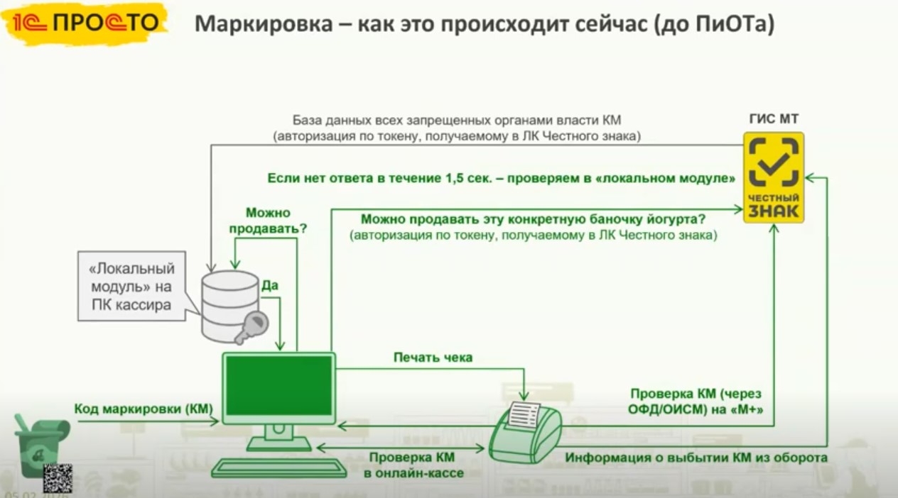 2. При продаже йогурта, при сканировании кода маркировки ПиОТ отправляет запрос в систему «Честный Знак». Если ответа нет в течение 1,5 секунд, программа сверяет марку в локальном модуле кассира: если там марки нет, проверка считается пройденной.