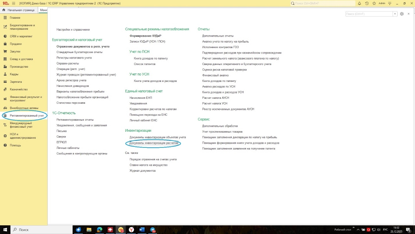 В этой статье мы разберем, как быстро и правильно оформить акт инвентаризации расчетов с помощью документа «Акт инвентаризации расчетов». Перейдите в раздел Регламентированный учет → Документы инвентаризации расчетов и создайте новый документ.