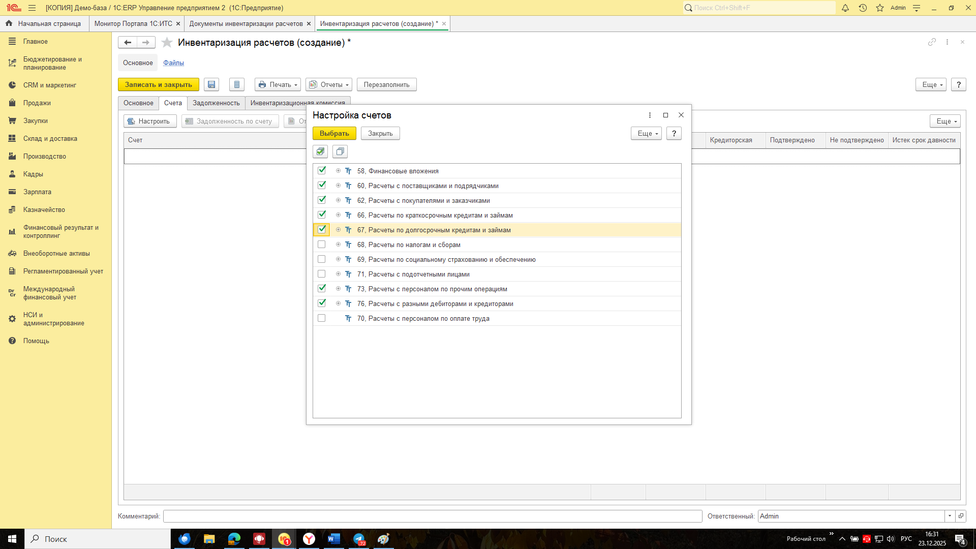 На закладке счета при нажатии на кнопку Настроить появляется меню выбора счетов, которые доступны к выбору для проведения инвентаризации расчетов. Предлагаю выбрать счета так, как это показано на картинке