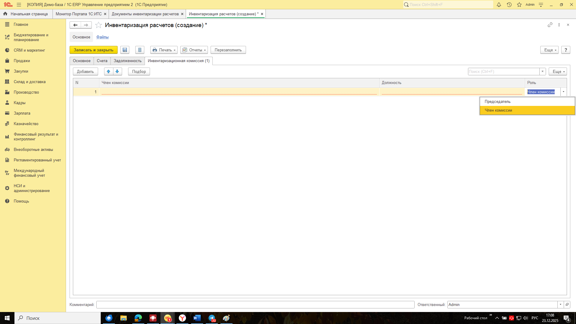 На последней закладке Инвентаризационная комиссия заполняем членов инвентаризационной комиссии: