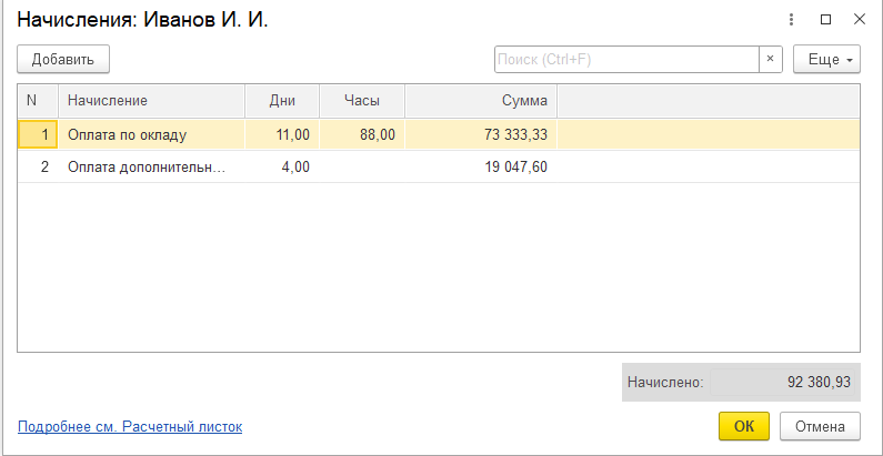 Руками исправляем количество отработанных дней и добавляем наше созданное начисление.