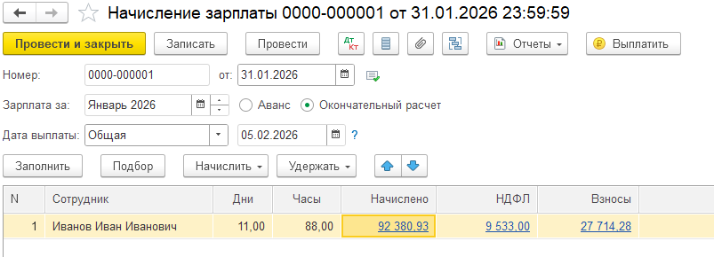 Начисление суммы оплаты за дополнительные выходные дни и расчёт страховых взносов осуществляются с помощью документа «Начисление зарплаты». Далее введем документ «Начисление зарплаты и взносов».