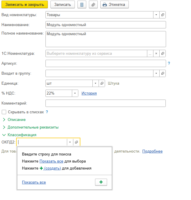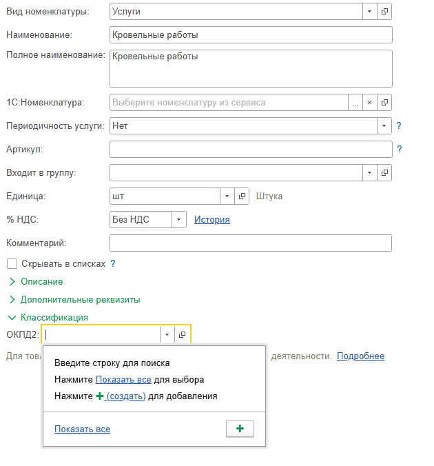 Оптимальный подход — указывать код АКПД-2 прямо в карточке товара или услуги. Тогда он автоматически будет использоваться во всех документах.
