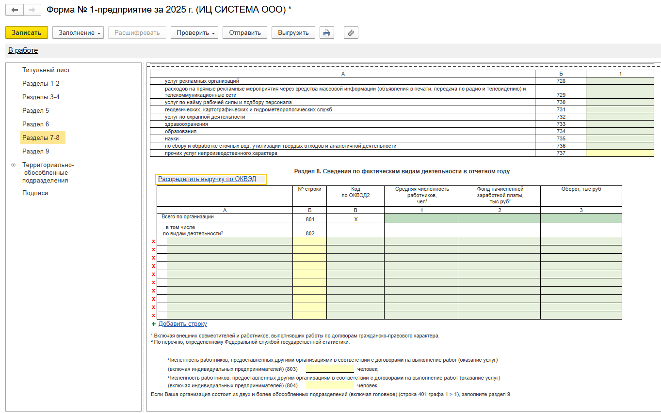 Для ряда статистических форм реализован механизм распределения показателей по ОКВЭД. Если код определяется неоднозначно, пользователь может задать правила вручную.
