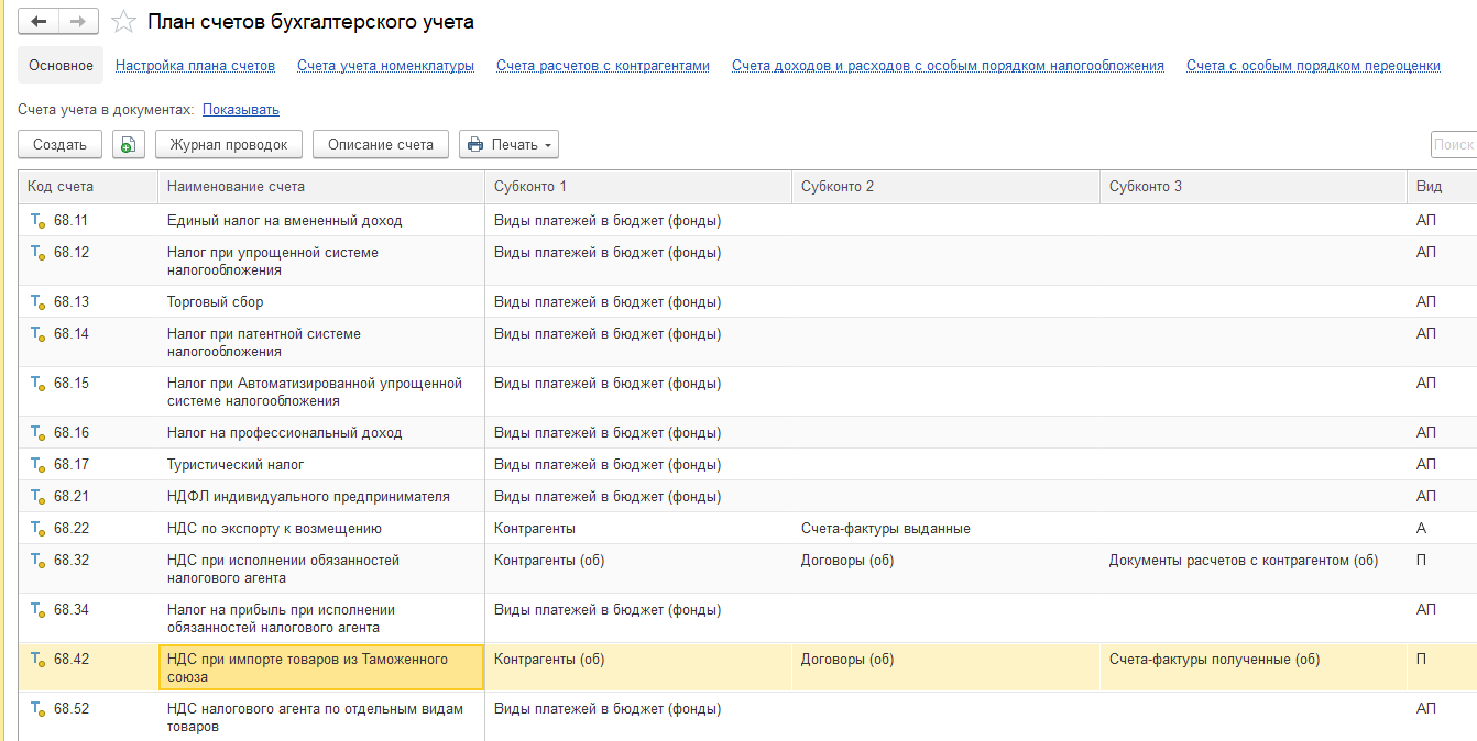 Как видим, аналитика счетов 68.32 и 68.42 отличается от остальных налогов.