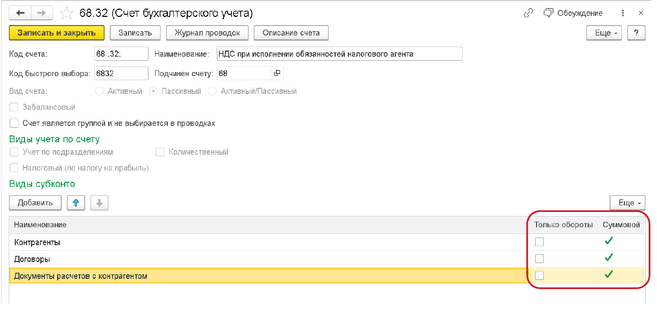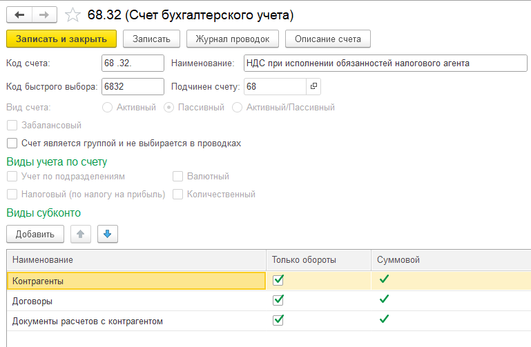 На субсчете 68.32 учитываются суммы начисленного и выплаченного налога на добавленную стоимость при исполнении организацией обязанностей налогового агента. Предприятие осуществляет проводки по субсчету, если она выступает агентом, приобретая товары (работы, услуги) у нерезидента, арендуя имущество муниципалитета, реализуя конфискованное имущество.