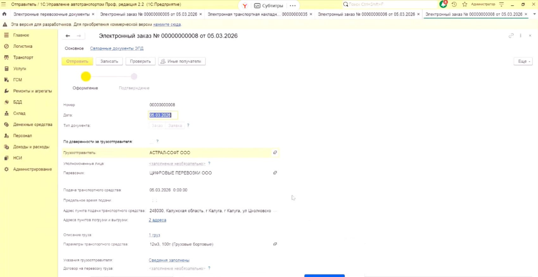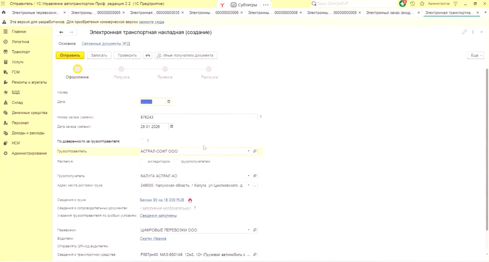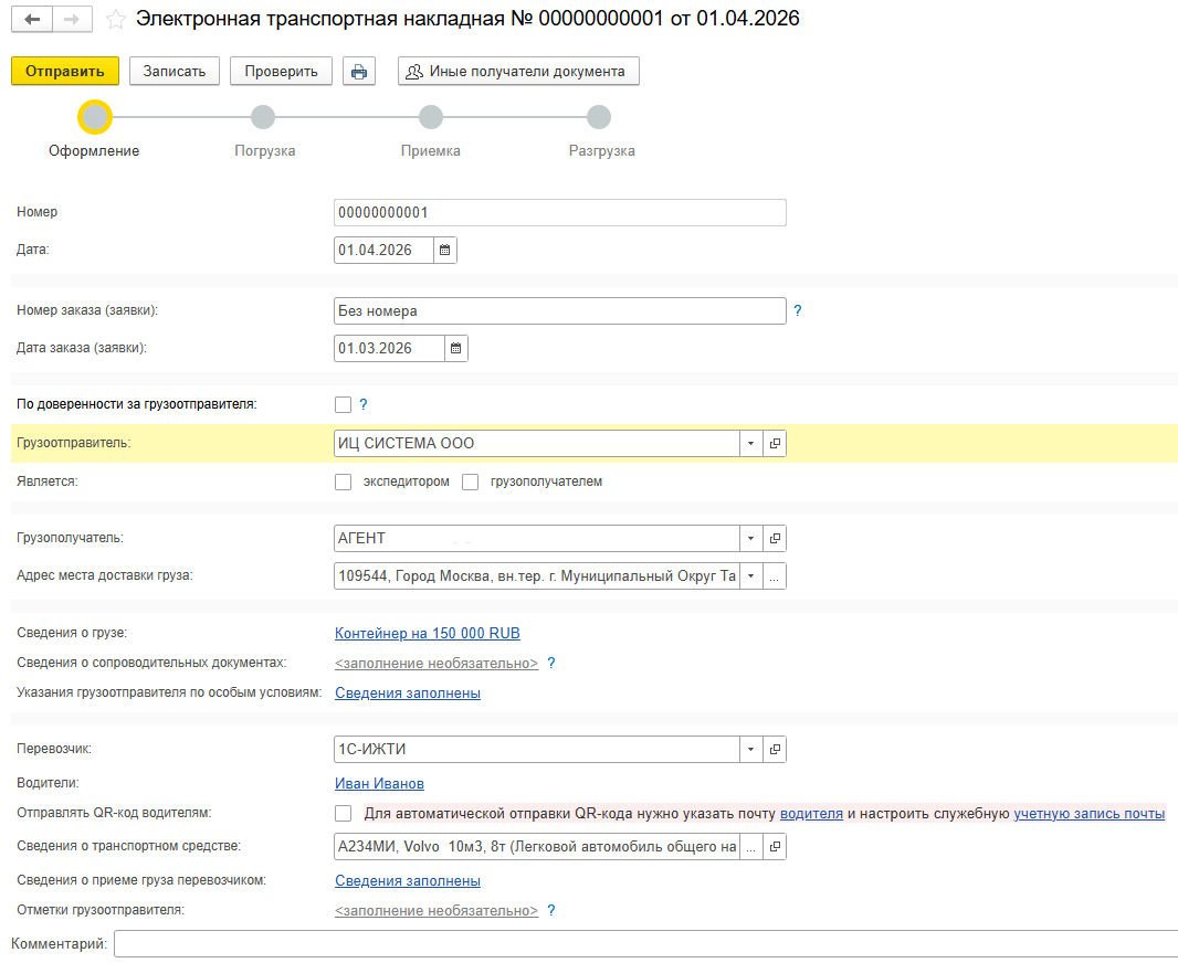 Так выглядит создание документа «Электронная транспортная накладная».