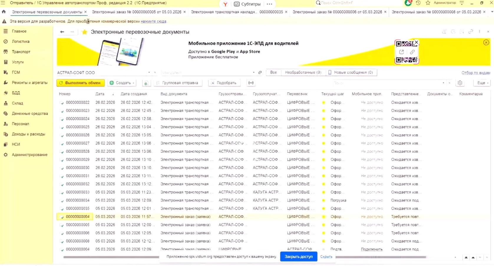 Так выглядит список Электронных перевозочных документов.