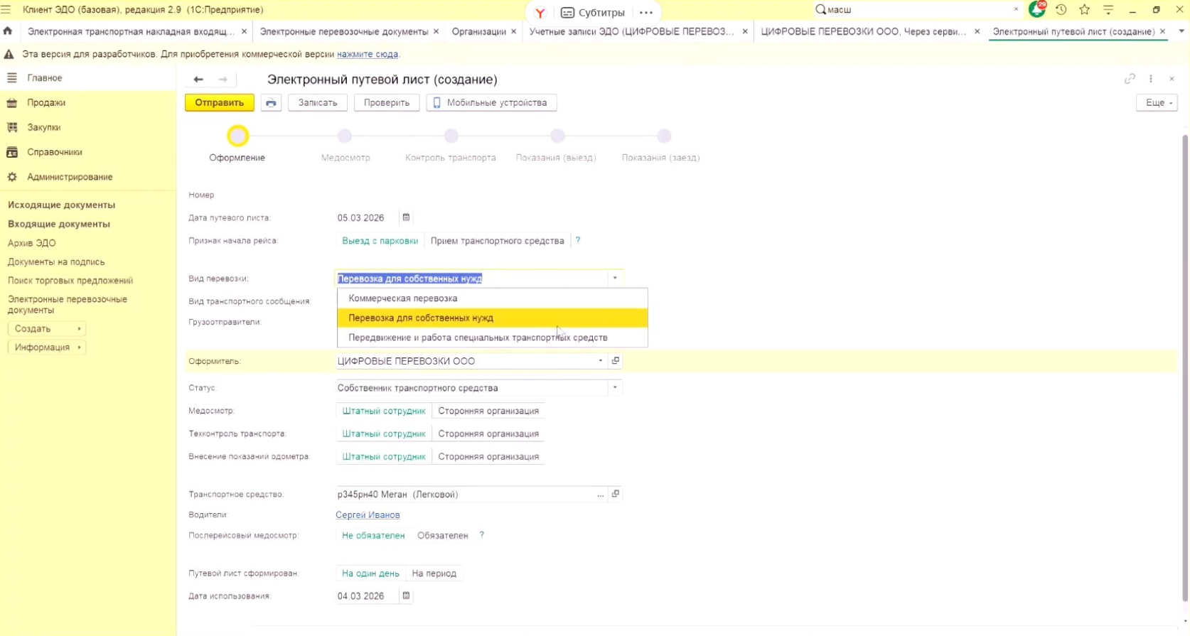 Вот так выглядит создание документа «Электронный путевой лист».