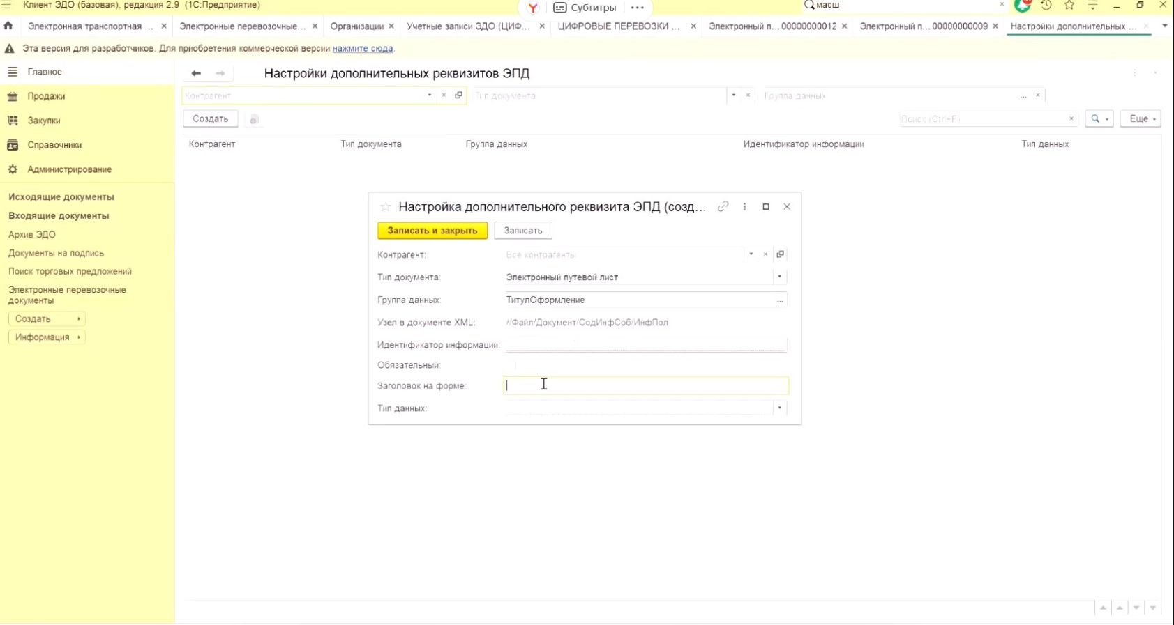 Для создания перевозочных документов перейдем в раздел продажи-электронные перевозочные документы и создадим электронную транспортную накладную, для ее отправки необходимо заполнить все реквизиты.