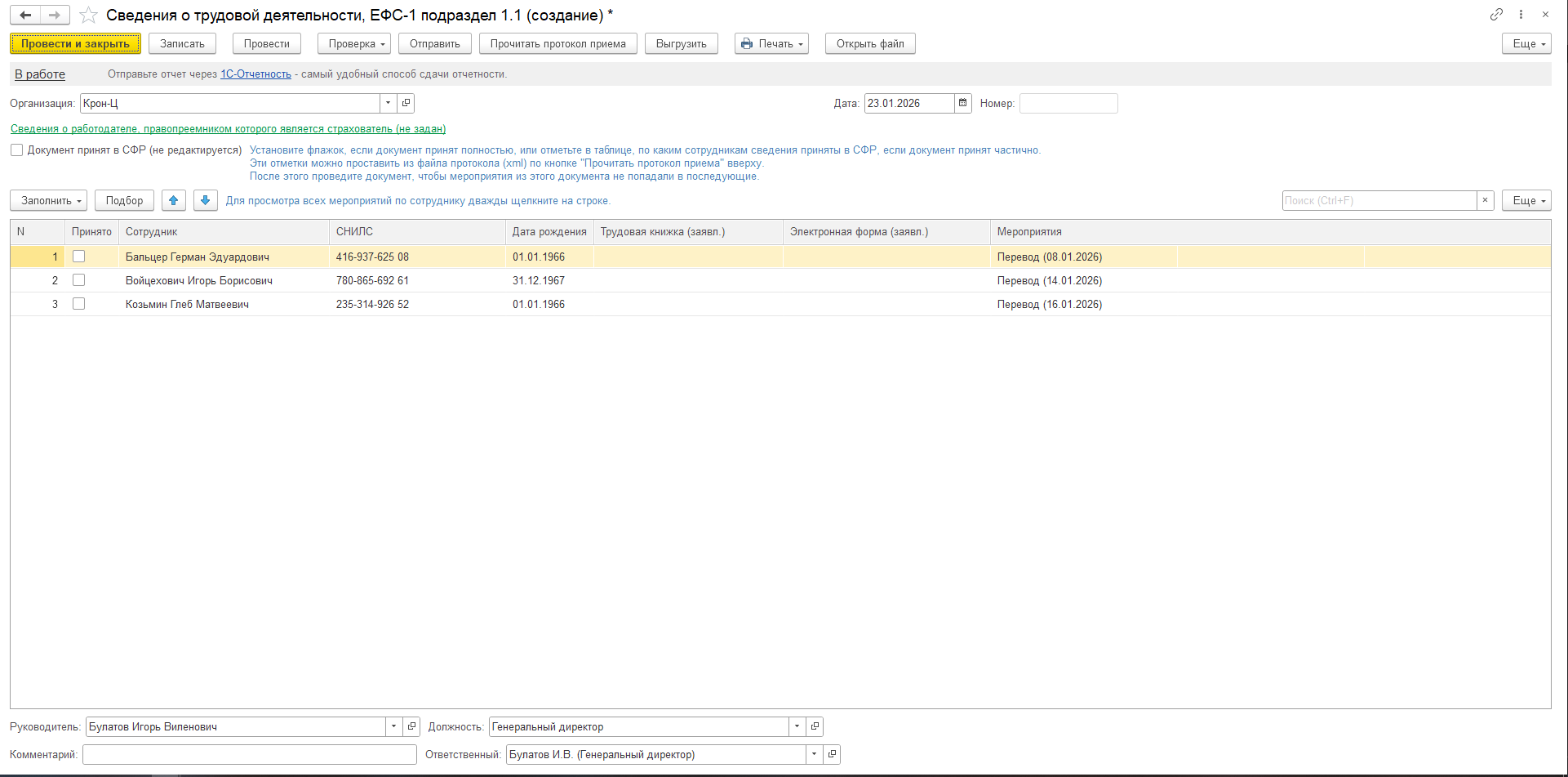 Подраздел 1.1 Раздела 1 — «Сведения о трудовой (иной) деятельности»: касается кадровых мероприятий «ПЕРЕВОД», «ПЕРЕИМЕНОВАНИЕ», а также передачи заявления о способе ведения трудовой книжки за декабрь 2025 года. Если же кадровое мероприятие «ПРИЕМ», «УВОЛЬНЕНИЕ» отчёт нужно сдать не позднее следующего рабочего дня после издания приказа.