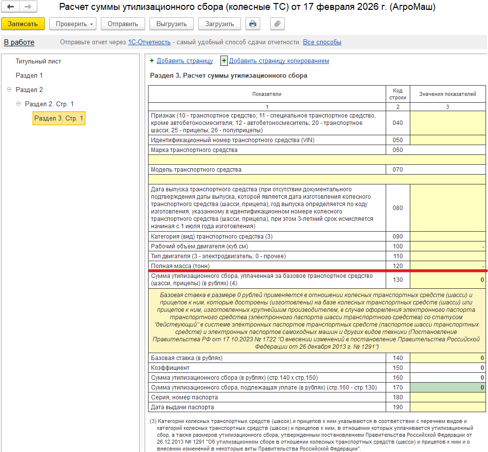 - Рекомендуется отражать мощность (в кВт) в строке 120 «Полная масса (тонн)» раздела 3 расчет