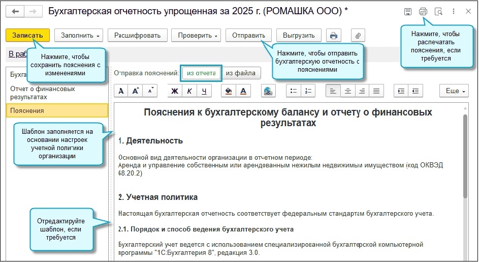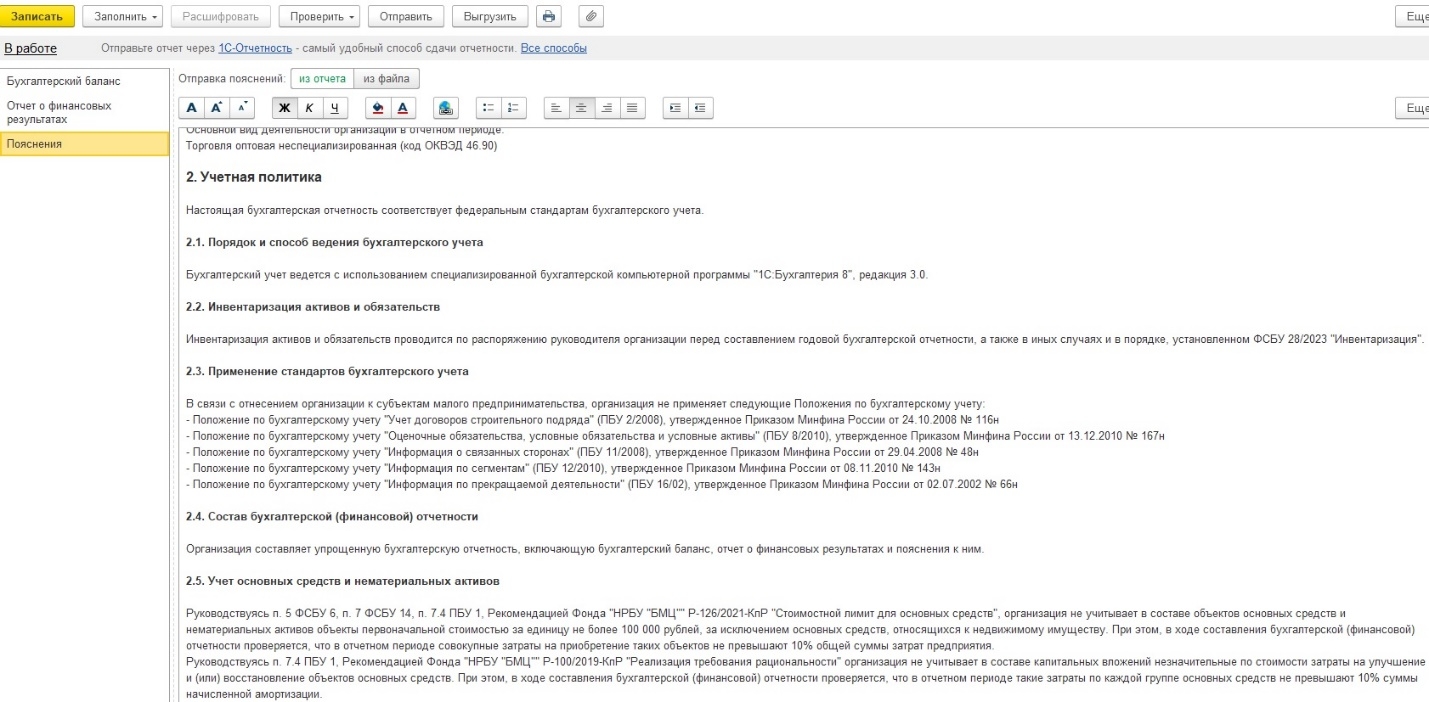 Главное нововведение для малого бизнеса. Теперь организации, применяющие упрощенные способы ведения бухучета, могут формировать пояснения к отчетности прямо в программе. Это требование пункта 54 ФСБУ 4/2023.