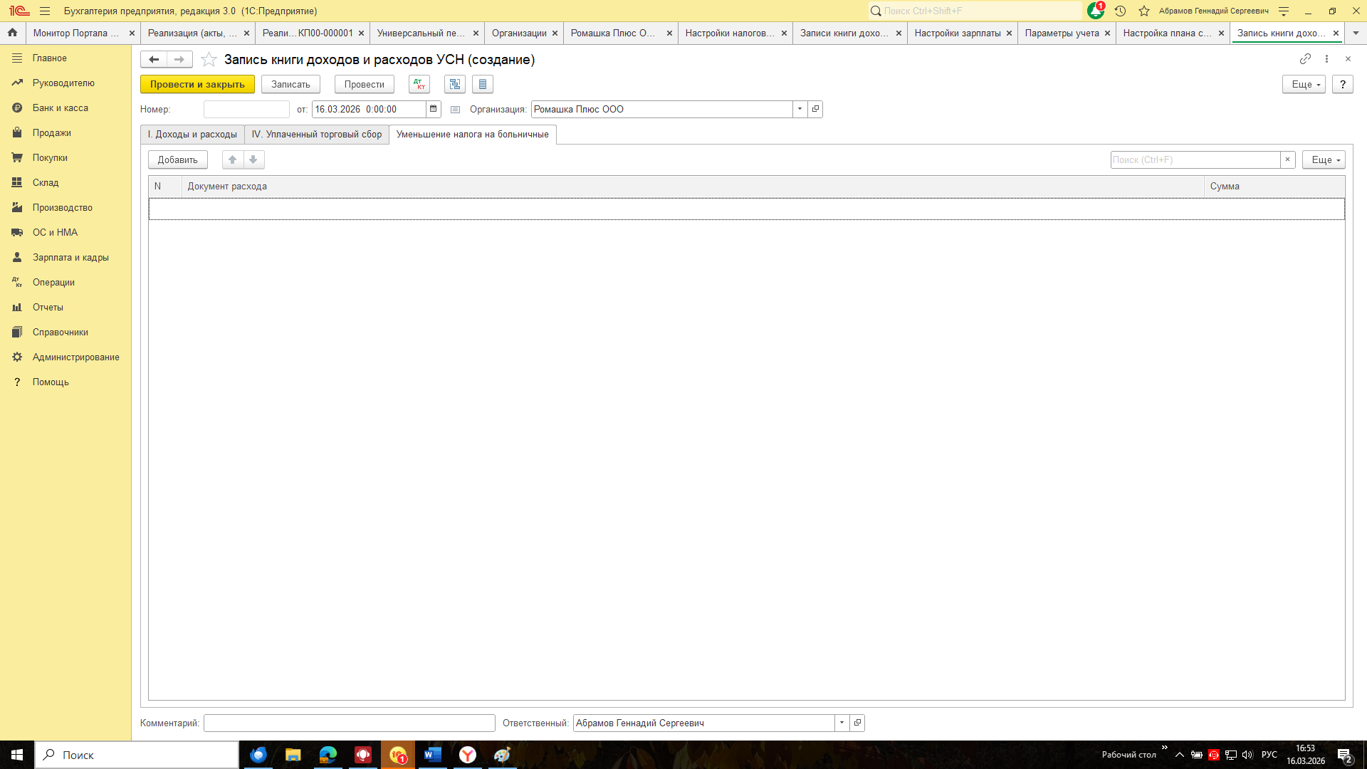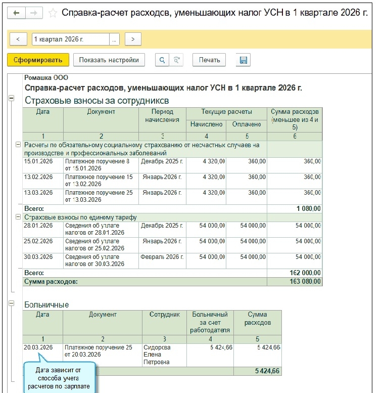 - Для сводного учета из внешних программ в документе «Запись книги учета доходов и расходов УСН» появилась специальная закладка "Уменьшение налога на больничные".