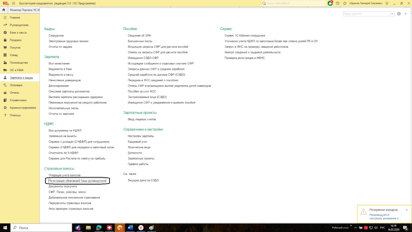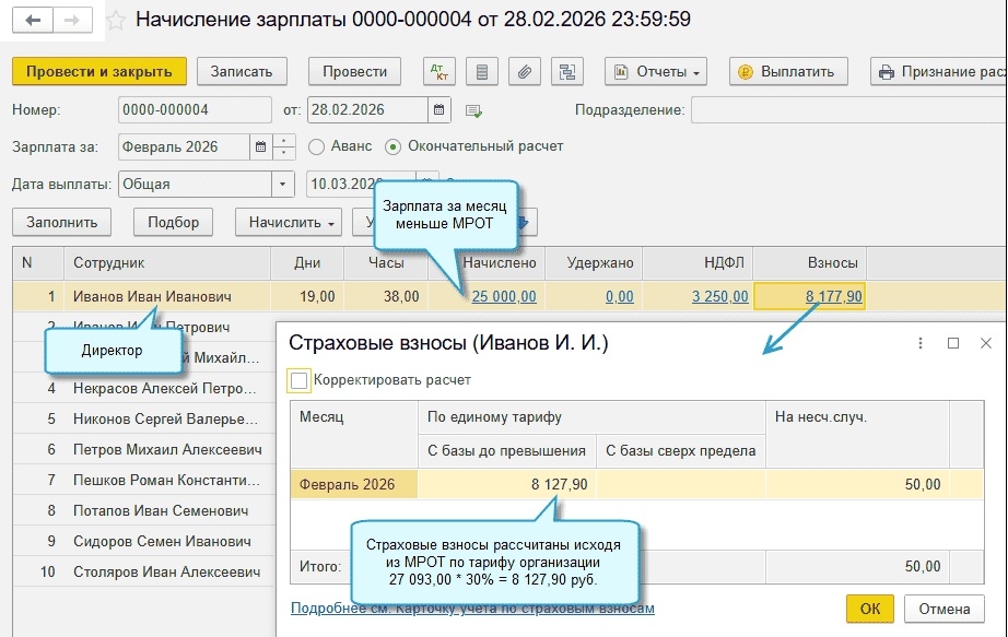С 01.01.2026 в случае начисления директору организации заработной платы меньше МРОТа страховые взносы должны быть исчислены с МРОТа. Документ «Регистрация налогооблагаемой базы руководителя» нужно создавать тогда, когда оклад руководителя равен 0 или трудовой договори вообще не заключён. Страховые взносы при этом рассчитываются и начисляются из этого документа.