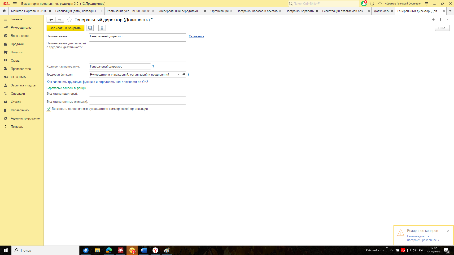 В противном случае (если трудовой договор заключен и оклад руководителя больше 0) страховые взносы начислятся при проведении документа «Начисление зарплаты» за нужный месяц. При этом нужно включить в должности руководителя флажок Должность единоличного исполнителя коммерческой организации