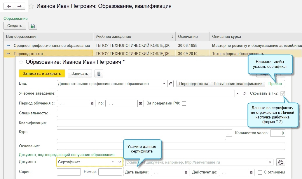 В программе добавлен ввод вида профессиональной подготовки «Прочее» для ввода данных о дополнительном профессиональном образовании.