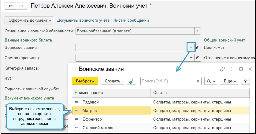 Также добавлено автозаполнение состава при выборе воинского звания в карточке сотрудника по воинскому учету