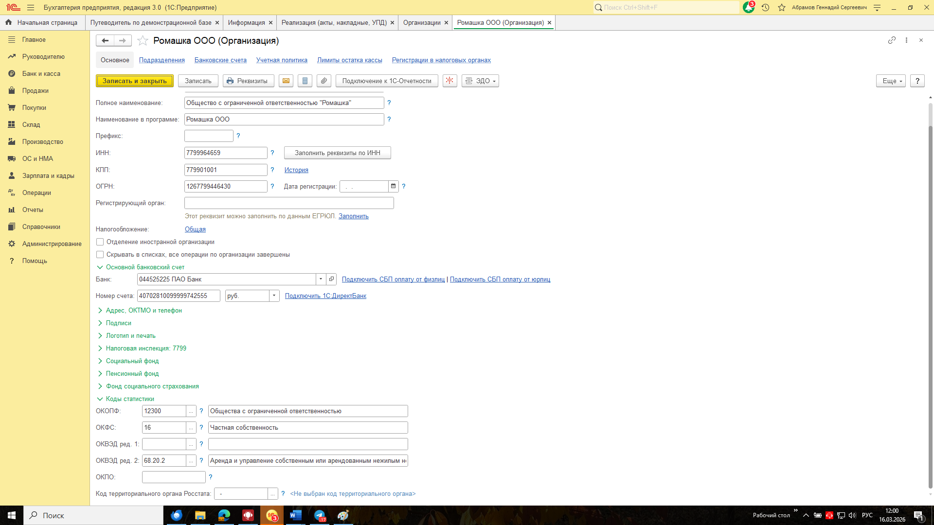 1. Основной вид деятельности автоматически подтягивается из справочника «Организации»