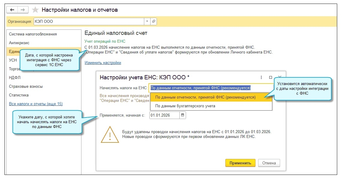 Настройка учета ЕНС стала более гибкой и теперь находится в разделе Главное -> Настройки -> Налоги и отчеты -> Единый налоговый счет.