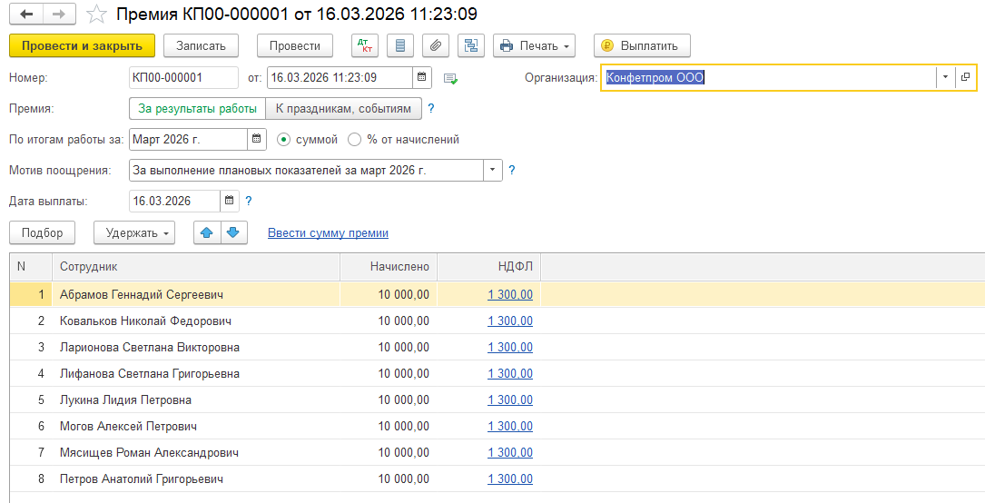 Если зайти в начисления, то видим сколько премий создалось автоматически.