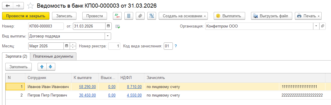 Также добавили возможность, вместо отдельных платежных поручений на каждого договорника – одна ведомость по зарплатному проекту.