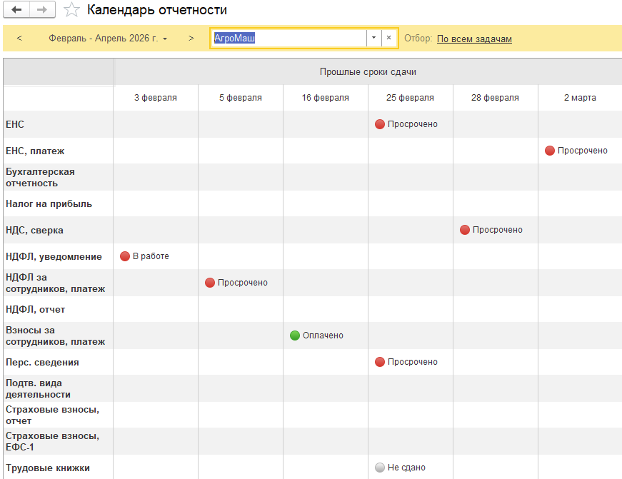 Календарь отчётности — встроенный инструмент в программах 1С (доступен в «1С:Бухгалтерия 8»), который помогает бухгалтерам и предпринимателям контролировать сроки сдачи отчётности, уплаты налогов и ответов на требования ФНС.