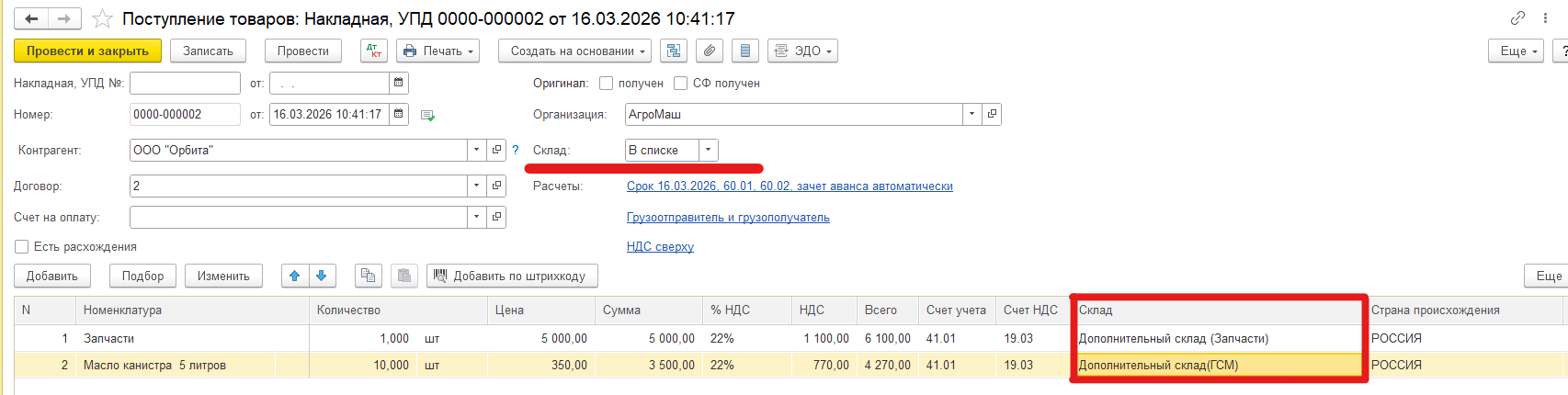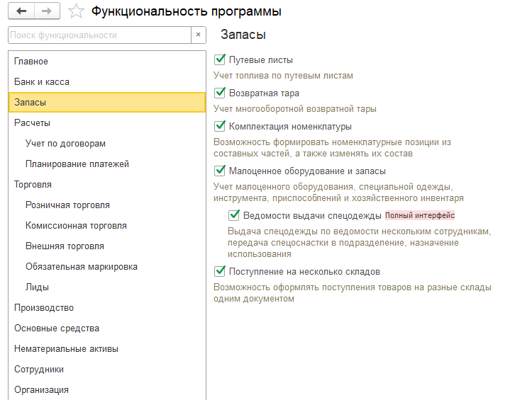 Чтобы включить данный функционал, перейдем в Главное-Функциональность – Запасы – Поступление на несколько складов