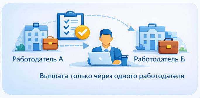 Если сотрудник работает у нескольких работодателей, но стаж в расчётном периоде недостаточный, пособие назначается только по одному страхователю — с учётом общего заработка.
